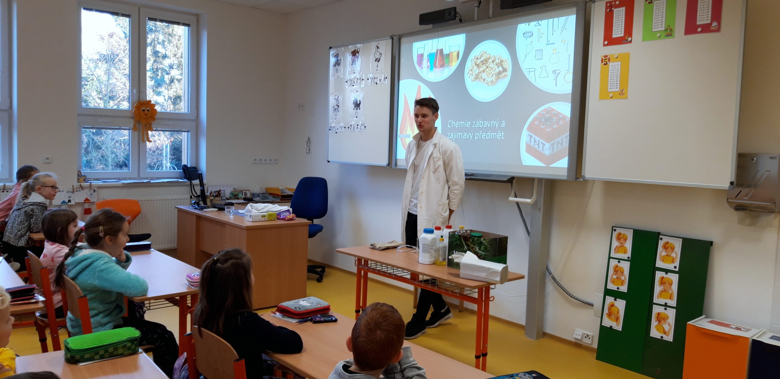 Dne 15. ledna 2020 k nám zavítal Michal Mašek – student 3. ročníku Gymnázia Přípotoční. Chtěl žákům druhých tříd (II. A, II. B, II. C) ukázat, co je to chemie, jak může být zajímavá, ale