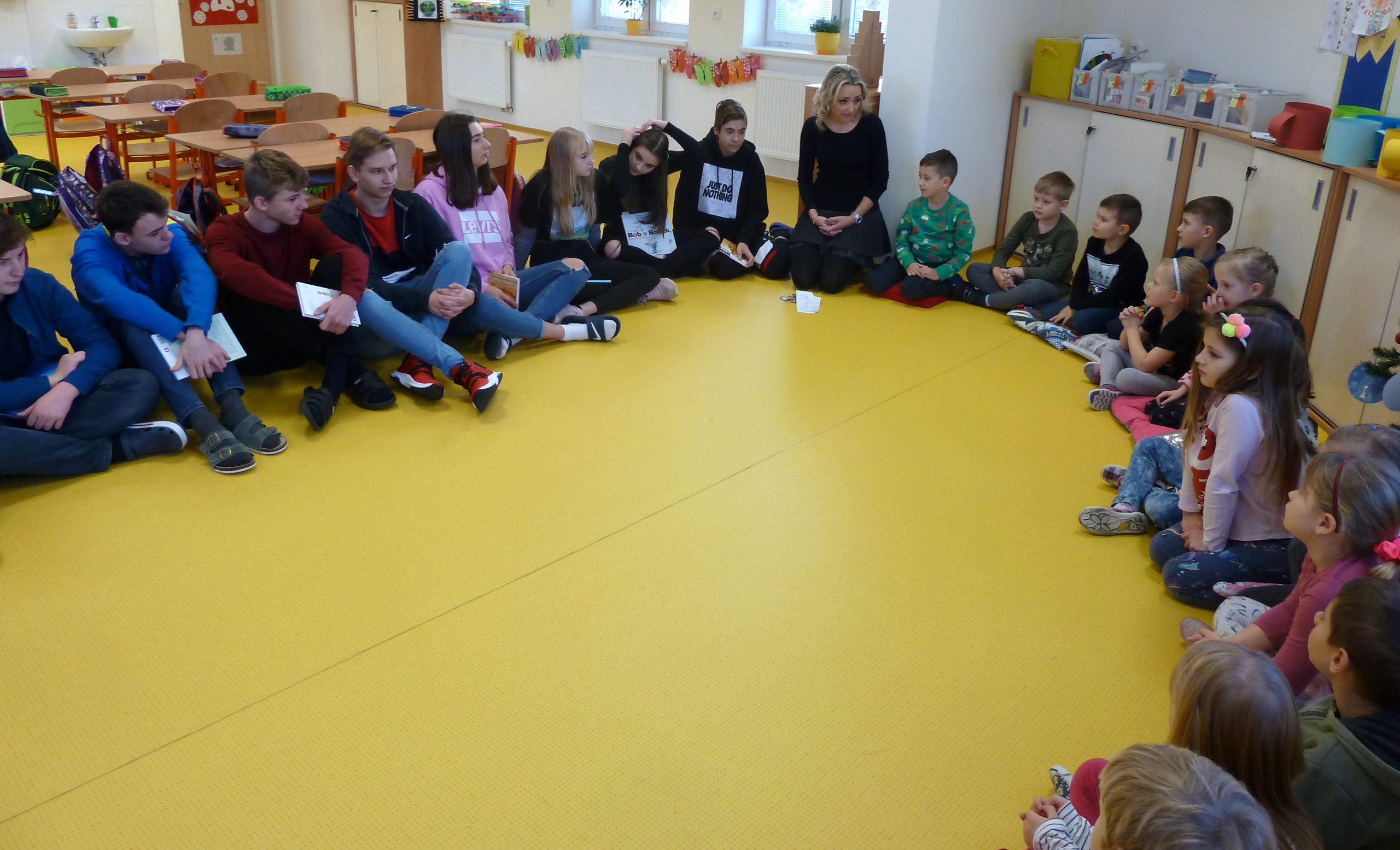 V prosinci se opět uskutečnila první společná dvouhodinová čtenářská dílna deváťáků a prvňáčků. Deváťáci si na ni přinesli svoji oblíbenou knížku, kterou v dětství rádi četli. Během první hodiny si společně s prvňáčky našli klidná zákoutí na