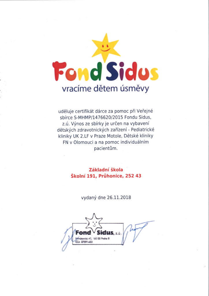 Začátkem měsíce listopadu 2018 se naše škola zapojila do dobročinné sbírky vyhlášené Fondem Sidus. Jejím cílem bylo získání finančních prostředků na pomoc při léčbě vážně nemocných dětí v České republice.