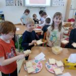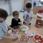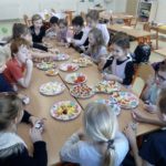Hlavní částí dne se stala hostina. Děti nejprve ve skupinkách připravily chlebíčky a jednohubky s avokádovou a vajíčkovou pomazánkou, dezert s borůvkami a malinami. Nakrájely a vkusně naservírovaly na tácky ovoce z projektu „Ovoce do škol“. Sestavily si dlouhý jídelní stůl a pak už jen ochutnávaly a chválily jídlo, které společně udělaly.