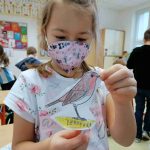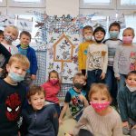 Ve výtvarné výchově žáci nakreslili tolik ptáčků, že papírové krmítko doslova obsypali.