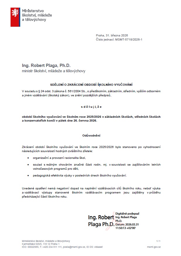 Dne 31. března 2026 rozhodl ministr školství, mládeže a tělovýchovy o zkrácení období školního vyučování.